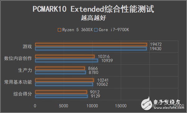 可以看到,在综合得分上锐龙5 3600X和价格更高的酷睿i7-9700K相差无几,具体到四个侧重不同的项目,二者互有胜负。