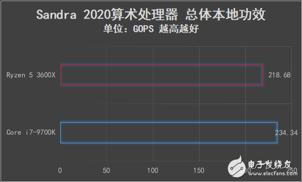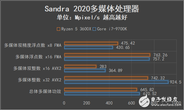 Sisoftware Sandra中的很多测试项目几乎都要用到AVX2指令集,对处理器的浮点性能非常敏感,而这也是此前AMD一代、二代锐龙处理器的弱势项目。此次“Zen2”架构的第三代锐龙处理器浮点单元位宽加倍,反映在测试结果上,锐龙5 3600X在Sisoftware Sandra的各项测试中和定位更高的酷睿i7-9700K相差不大,可谓是补足了此前的短板。