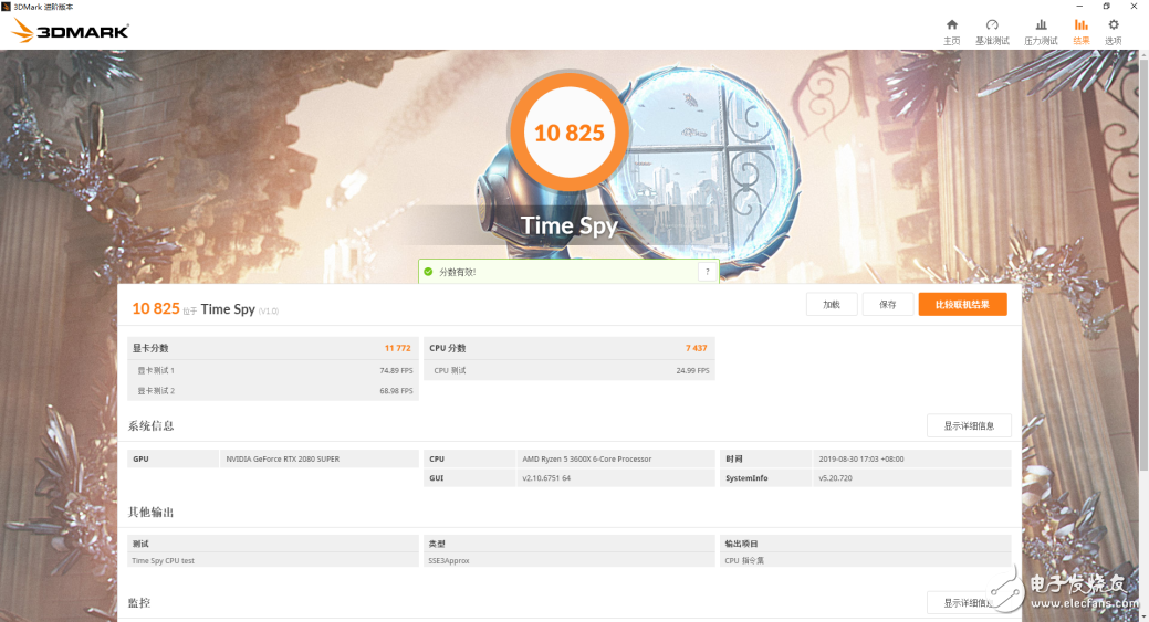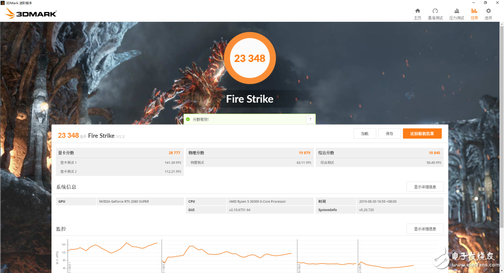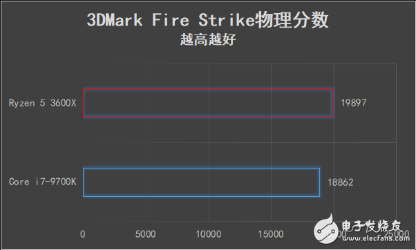 Fire Strike场景反应DX11的游戏性能,锐龙5 3600X成绩为19897分,相对酷睿i7-9700K还要高一些。