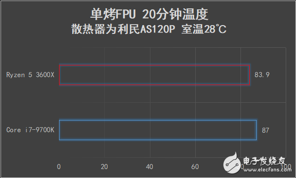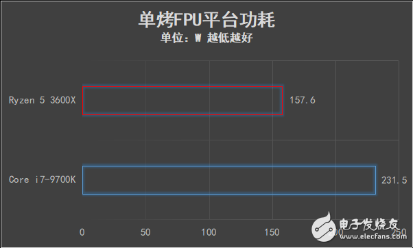 在室温28℃的环境下,使用AIDA64自带的系统稳定性测试进行单烤FPU 20分钟后,锐龙5 3600X的频率稳定在4.05GHz上下,RYZEN MASTER自带的温度监测显示为83.9℃,通过功率检测仪显示的平台功耗为157.6W。与之对比,在同样环境下,i7-9700K单烤FPU 20分钟后,核心温度高达87℃,整机平台功耗231.5W。可在7nm工艺的加持下,锐龙5 3600X能耗比表现较为出色。