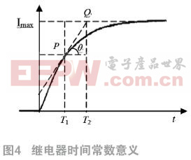 电磁继电器的线圈时间常数在衔铁不同状态下是变化的,下面根据继电器衔铁固定于最大张角时的线圈电流来分析时间常数的意义。图4中P为曲线任意一点,若从P点以tanθ为斜率的直线上升到电流稳态值,所用时间为T2-T1=τ,即从曲线任意一点以该点斜率匀速上升到最终稳态值所用的时间就是时间常数τ。