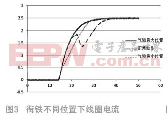 对同一台直流电磁继电器试品进行线圈电压U的通电试验,之后分别固定衔铁于工作气隙最大位置和最小位置,进行线圈电压U的通电试验。试验过程均测录线圈电流波形,试验结果如图3所示。