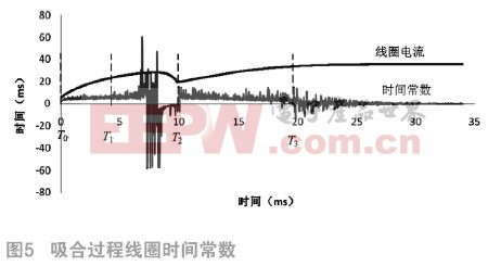 从T0时刻开始,在触动阶段,线圈时间常数几乎不变;在T1时刻,衔铁开始移动,导致时间常数增加,时间常数波形开始呈现明显的波动,由此可以判断衔铁在T1时刻开始吸合;T2时刻是衔铁闭合的瞬间,由于衔铁及触点的弹跳,时间常数在这一时刻附近存在一定的波动。在触点稳定接触后,吸合过程进入到蓄磁阶段,时间常数趋势线几乎为水平,当电流大致达到稳定值T3时刻后,时间常数接近0。