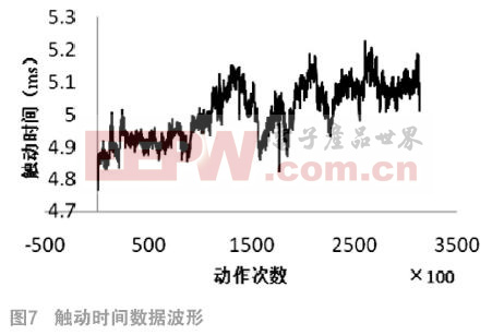 利用该测试系统采集一个继电器试品全寿命实验(吸合30万次以上)中触动时间的监测数据。由于数据量巨大,为减小数据的不确定性和分散性,采用分段平均法对数据进行预处理,即按照时间序列,每100个数据求取一个平均值。数据波形见图7,随着继电器试品动作次数的增加,衔铁触动时间呈现明显的增长趋势,反映了继电器性能的退化。因此,在继电器吸合过程中,通过监测衔铁触动时间的动态特性,可以实现对继电器的可靠性评估。
