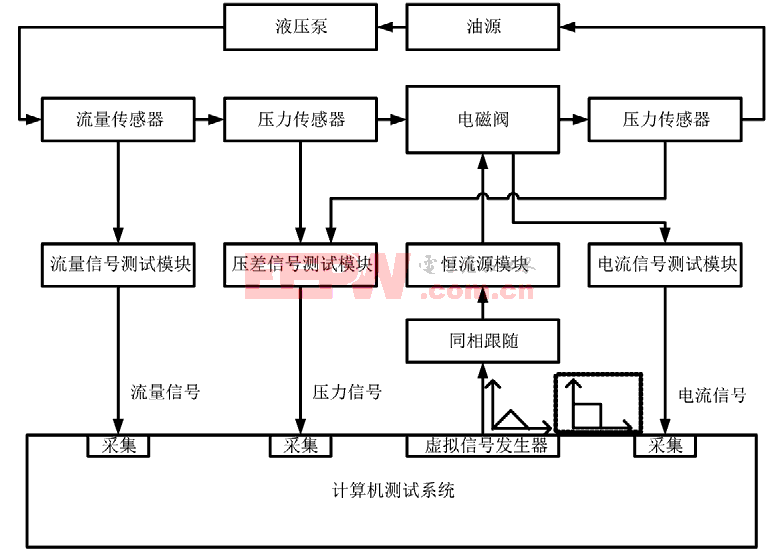 进行动态特性测试时,计算机测试系统输出方波信号, 经恒流源模块输出给电磁阀线圈。电流信号测试模块将阀线 圈电流信号调理成对应比例的电压信号后,输出给计算机测 试系统采集。流量信号测试模块负责流量阀测试,在进行流量电磁阀测试时,流量信号测试模块将液压系统中的流量传 感器输出信号调理成等比例流量信号后,输出给计算机测试系统采集。同样地,压差信号测试模块负责压力阀测试,测 试时,压差信号测试模块将A、B腔压力传感器输出信号调理成等比例压力差信号后,输出给计算机测试系统采集。图2是静/动态特性测试功能结构图。下面对各主要模块做详细介绍。