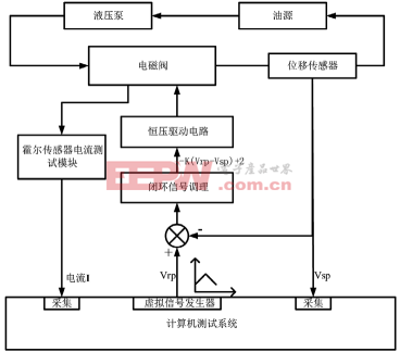 闭环测试时,计算机测试系统虚拟信号发生器输出偏 置的三角波信号Vrp,同时采集位移传感器输出信号Vsp,闭 环信号调理模块首先将两信号接入减法器电路,对两信号做 差得 ,再对信号进行K倍(K值可调)放大,然后对放大后的电压信号进行反向,再叠加一个2V电压,闭环信号调理模块将两电压信号调理成 后输出,但 此时的信号是无功率的电压信号,无法驱动电 磁阀线圈工作,恒压驱动电路将调理后的电压 信号进行功率放大后,输出给电磁阀线圈。图5 是闭环特性测试功能结构图。