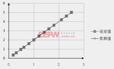 流量和压力电磁阀静态测试时,均需三角波信号,所 以对恒流源模块的线性度要求较高,图4是恒流源模块线性 度测试曲线,由图4可知,恒流源电流输出能力在5A以上, 电路能够保持非常好的线性度,非线性误差<1‰,远高于 测试需求。