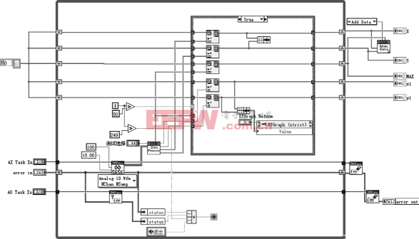 在电液电磁阀静态试验中,要对电磁阀的电流,压力 和流量等参数进行采集,因此数据采集是测试软件编程的重 要部分。本系统的数据采集主要是对模拟信号的采集,图7 是信号采集程序框图。