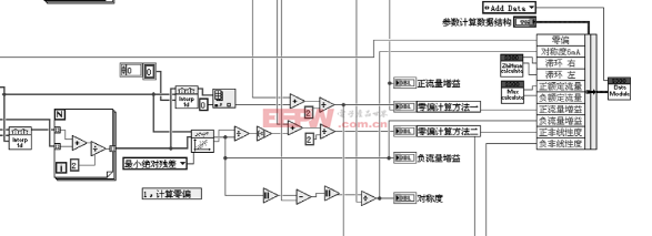 电磁阀的很多测试项目需要计算特性参 数,由于实际误差的存在,计算机采集的数 据往往不是理论函数的表达,这就需要将测 试的数据进行数值处理,使得绘制曲线以吻 合平滑曲线,从而准确求取特性参数。以电 磁阀零偏参数的计算方法为例,首先介绍名 义流量曲线的概念,名义流量曲线是流量回 线的中点轨迹。零偏是名义流量曲线与零流量轴线交点的电流值。本系统中零偏的程序 实现是:首先对计算机采集的流量数据和电 流数据进行分段插值,利用插值函数求取名 义流量曲线,但是此时得取的只是名义流量曲线上一些离散 的数据点,并无法计算出此名义流量曲线与零流量轴线交点 的电流值,利用LabVIEW曲线拟合程序中的基于最小绝对残 差的直线拟合方法拟合出名义流量曲线,进而求取此曲线与 零流量轴线交点的电流值,即零偏值。图9是曲线拟合程序