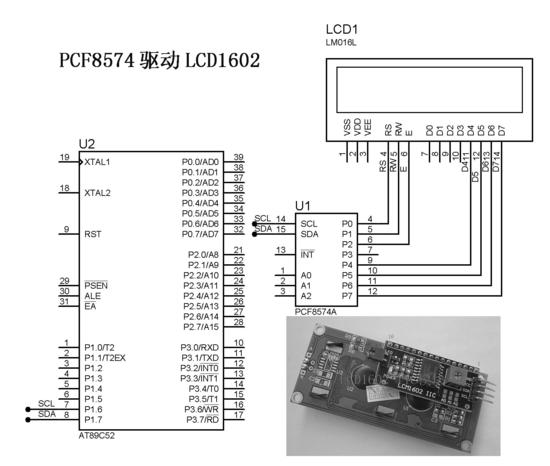 下图是PCF8574模块与1602的连接电路图: