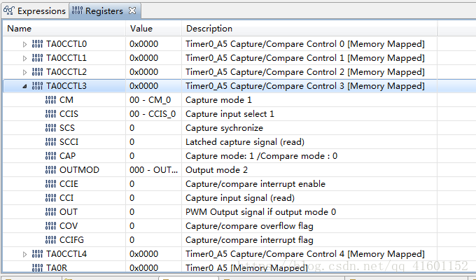 然后我们可以通过写TA0CCTL3里面的寄存器,来选择模式,关于什么模式下是什么作用,可以通过头文件,看头文件里面的注释,也可以通过看上图Register中Value一栏的值,如:CM下的00-CM_0功能是Capture mode 1(捕获模式1)。