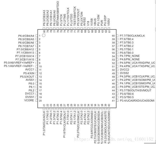上面分别是CCS单步调试的时候的寄存器图和MSP430F5529的引脚图,根据引脚图我们可以知道,关于定时器TA0.0相关的功能在P1.1引脚上,以此类推对应起来。这次我用到的是P1.4引脚,也就是TA0.3,选择了TA0.3那么,相对应的捕获到的时间的值,是在TA0CCTL3那里。