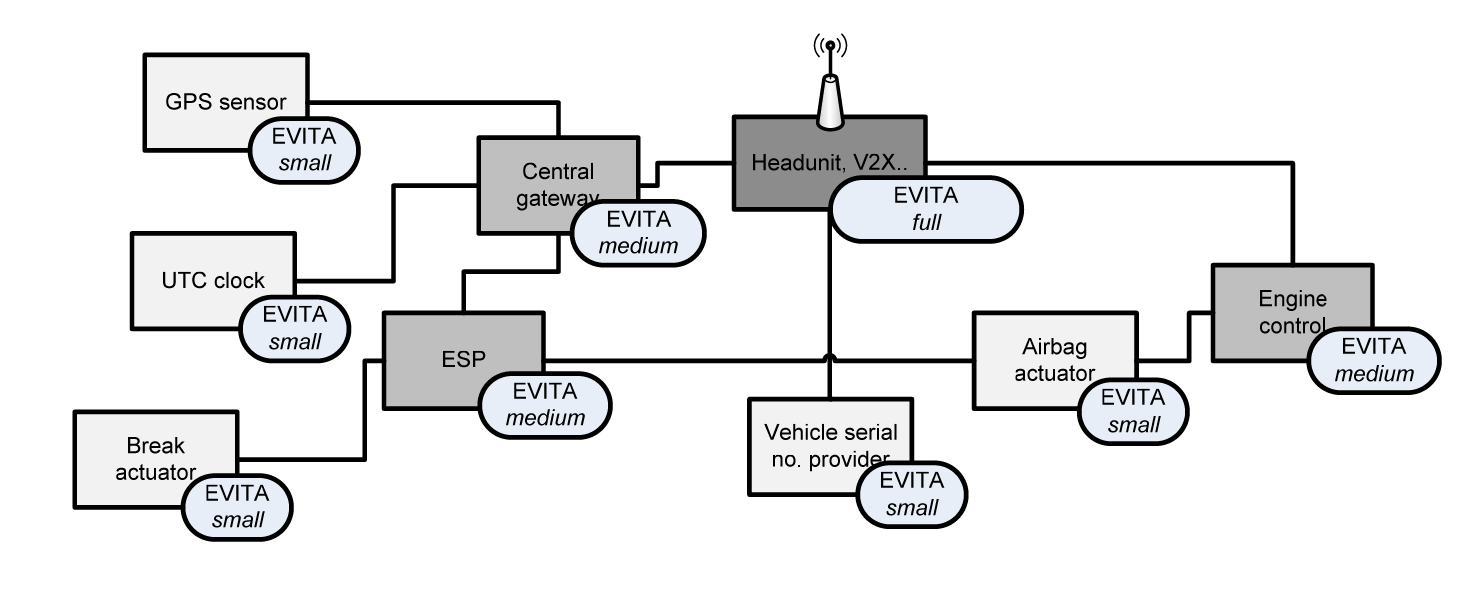这方面的一个主要示例是欧盟资助的EVITA研究项目,其中包括宝马、大陆集团、富士通、英飞凌和博世等数家企业。EVITA项目提出了许多指导原则,详细描述了各种汽车ECU安全架构的设计、验证和原型设计。此外,EVITA规定所有关键ECU均需要配备芯片,其中不仅要包含专用硬件安全模块(HSM),还要包含CPU;其中为HSM定义了三种不同要求的配置:全型、中型和小型。这些模块对ECU之间交换的所有信息进行加密和解密。