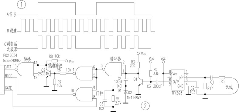 将分频之信号分为二路,一路经低通滤波电路送至PIC16C54单片机输入脚(假设为DATA脚),另一路与单片机控制脚(假设为GATE脚)信号作NAND之后送入单片机的RTCC脚。在此只利用2SC945之反应速度不够快,即可去除无线高频载波成分。PIC16C54振荡频率为20MHz,内部计数器来源则需设定为RTCC脚。