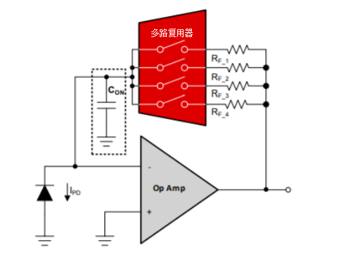 忽略多路复用器的CON规范时,TIA电路可能会出现稳定性问题。多路复用器的CON可能会引起振荡,从而导致信号链的瞬态性能较差。尽管系统设计人员可能不会有意在设计中增加电容,但多路复用器的CON可能足够大,以至于影响系统。