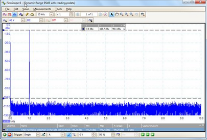 在大多数的数字示波器中,从模拟到数字的转换器都只有8位分辨率,可产生256个量化水平。这相当于是一个理想的48dB的动态范围。PicoScope4262有一个16位分辨率模拟到数字的转换器,可以产生65536个量化水平,动态范围增加到96dB。