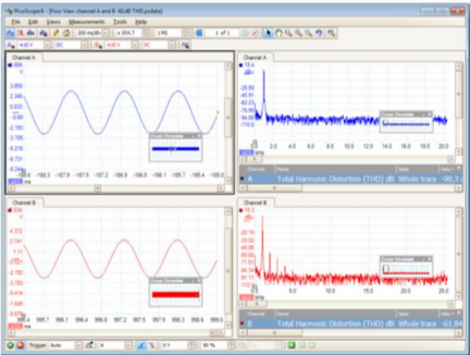 这个测试检测的是立体声放大器的失真度。它展示了PicoScope示波器如何自动检测谐波,即使是在时域波形看起来很整洁的情况下。PicoScope4262有足够的动态范围可以去捕捉这些信号中是否含有噪音或者是否产生失真。