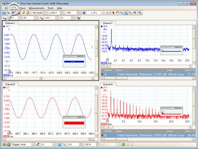 图4 通道A和B的四个视图,通道B THD为 -61dB。在时域视图中看不到失真。