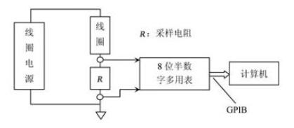 该测试系统组成结构如图1所示,线圈电源给线圈与采样电阻R提供电流,8位半数字多用表采集采样电阻R上的电压信号,电压数字化数据经GBIB接口连线输入到计算机,计算机进行分析处理并实时显示。