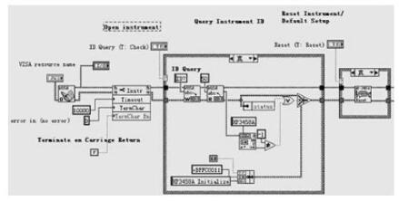 lNSTR;其次测试3458A是否与计算机正常连接,如果给3458A发指令“ID-”,仪器将会返回“HP3458A”,因此利用这一点就会很方便的知道3458A是否正常与计算机连接,其程序框图如图4所示。