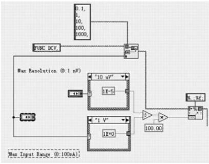 (2)定义范围方式:例如若使用“DCV 2.5”命令,则将设置万用表3458A的最大输入电压为2.5 V,万用表白动选择量程为DC10 V,其程序框图如图6所示。