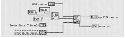 通电后3458A首先处在power-on状态,此状态下trigger arm,trigger,sample events事件都预设置为AUTO模式,这使得万用表处于不断的读数状态,所以在为万用表的测量设置之前,必须先悬挂读数,使其不在读数状态。解决此问题的方法是presetting万用表,即发送“PRESET NORM”或者“PRESET FAST”命令,其程序框图如图5所示。