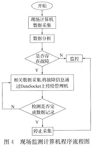 现场监测计算机应用软件由数据采集模块、数据分析模块、故障告警模块和本地波形监控模块四个主模块组成。为了实现对供电系统中监测线路的监控,现场监测计算机首先要通过数据采集模块对所监测线路的信号进行采集,并能够利用数据分析模块进行分析,如对电压电流稳态/瞬态参数进行分析,并能够实现对电网进行谐波分析、畸变分析和功率因数分析等,然后将根据分析结果自动判断是否存在故障,若有故障,通过故障告警模块将故障信息上传给管理计算机,同时保存相关数据;若没有故障,则放弃保存该部分数据。为了监测方便,该软件也可以先记录数据,然后进行特性参数分析,或直接进人单个模块直接分析参数。本地波形监控模块同步实时采集多个通道的波形,并能通过网络把现场监测结果发送给管理计算机,以供用户在远程终端监测。数据采集模块、数据分析模块和本地波形监控模块都包含数据存储、回放和生成报表及打印等功能。现场监测计算机程序流程如图4所示。