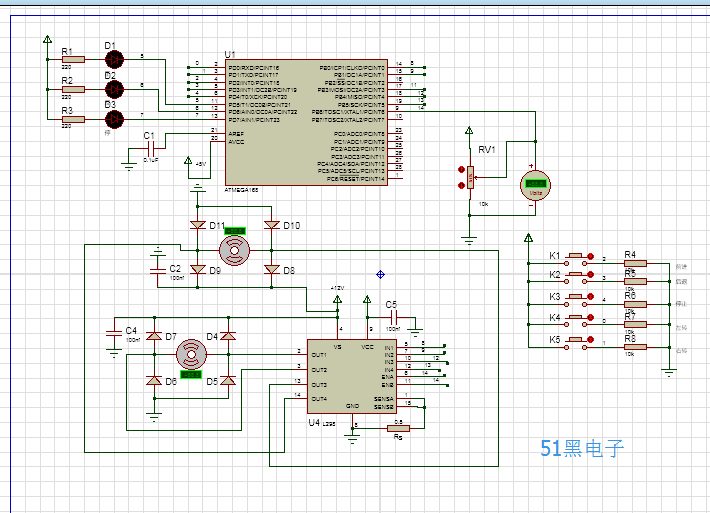 ATMEGA168单片机+L298仿真原理图如下