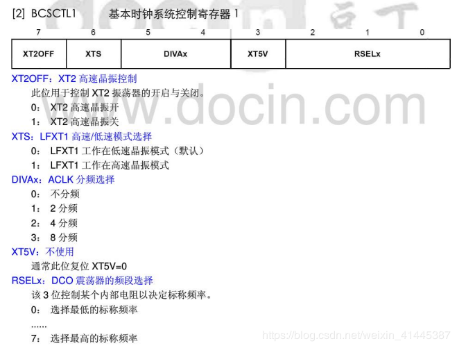 1-ACLK: 辅助时钟信号。由图所示,ACLK 是从 FLXT1CLK 信号由 1/2/4/8 分频器分频后所得到的。由BCSCTL1 寄存器设置DIVA相应为来决定分频因子.ACLK可用于提供CPU外围功能模块作时钟信号使用。