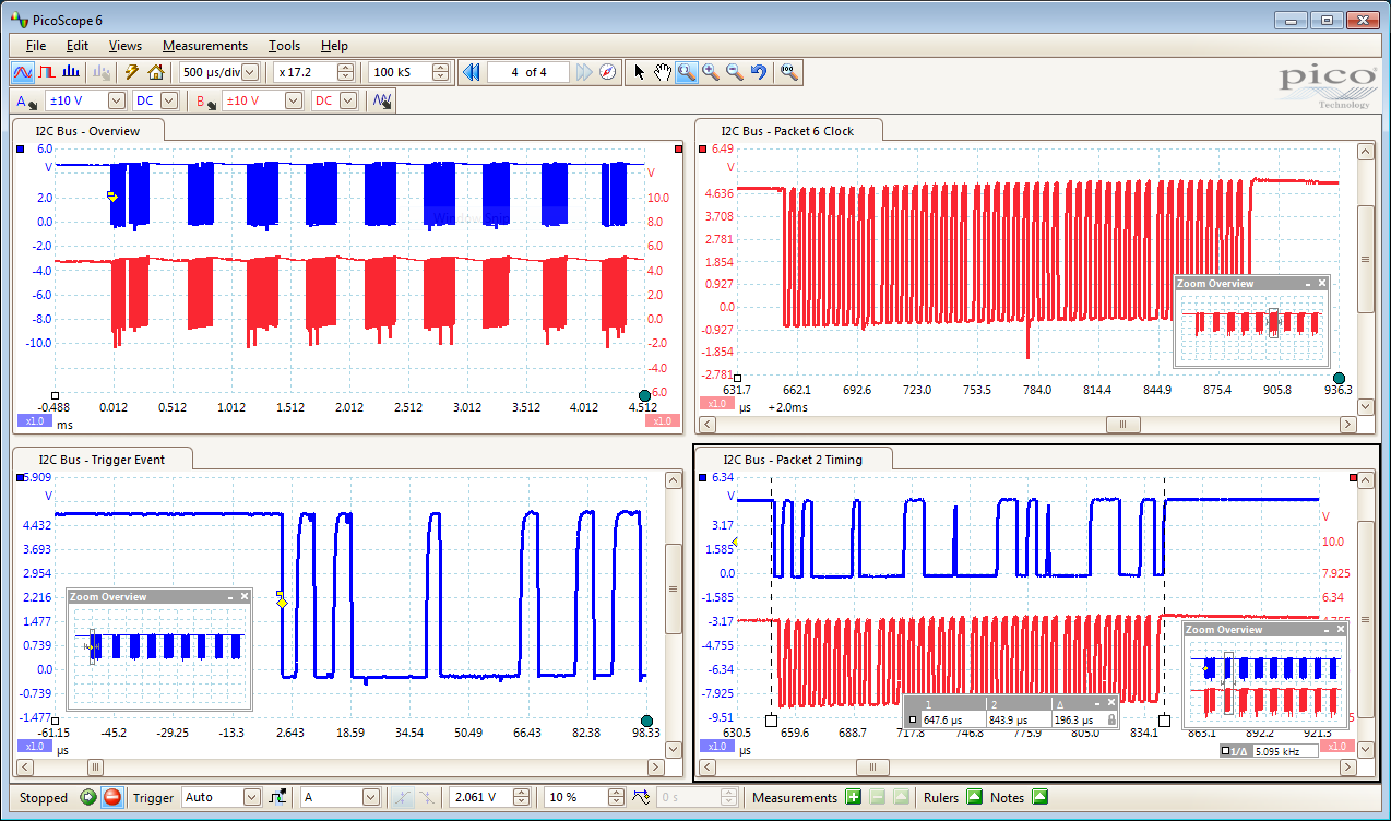 图1 用PicoScope 2200A 示波器捕捉一个简单的I2C时钟和数据波形的截图。四个图表面板分别显示了不同缩放比例下的波形,允许用户查看波形中感兴趣的部分。