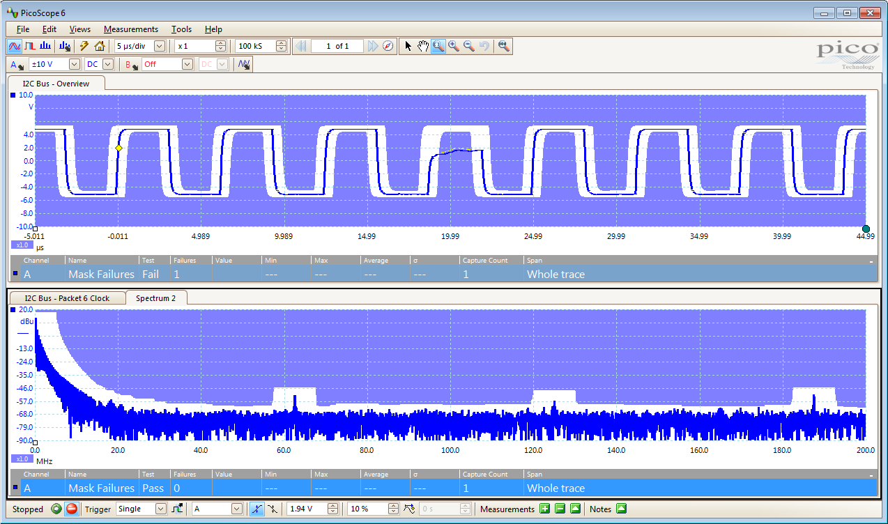 图3 显示了PicoScope 的波罩测试,时域和频域均可用。如果开关电源的峰值对数据总线造成干扰,那么就会很明显的显示在频域上,同时触发一个警报。
