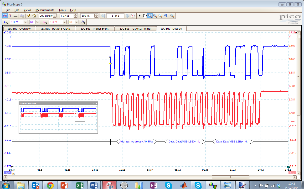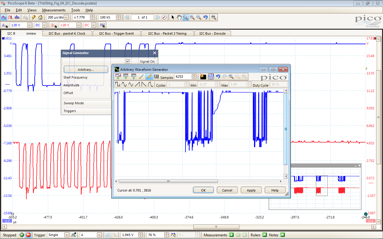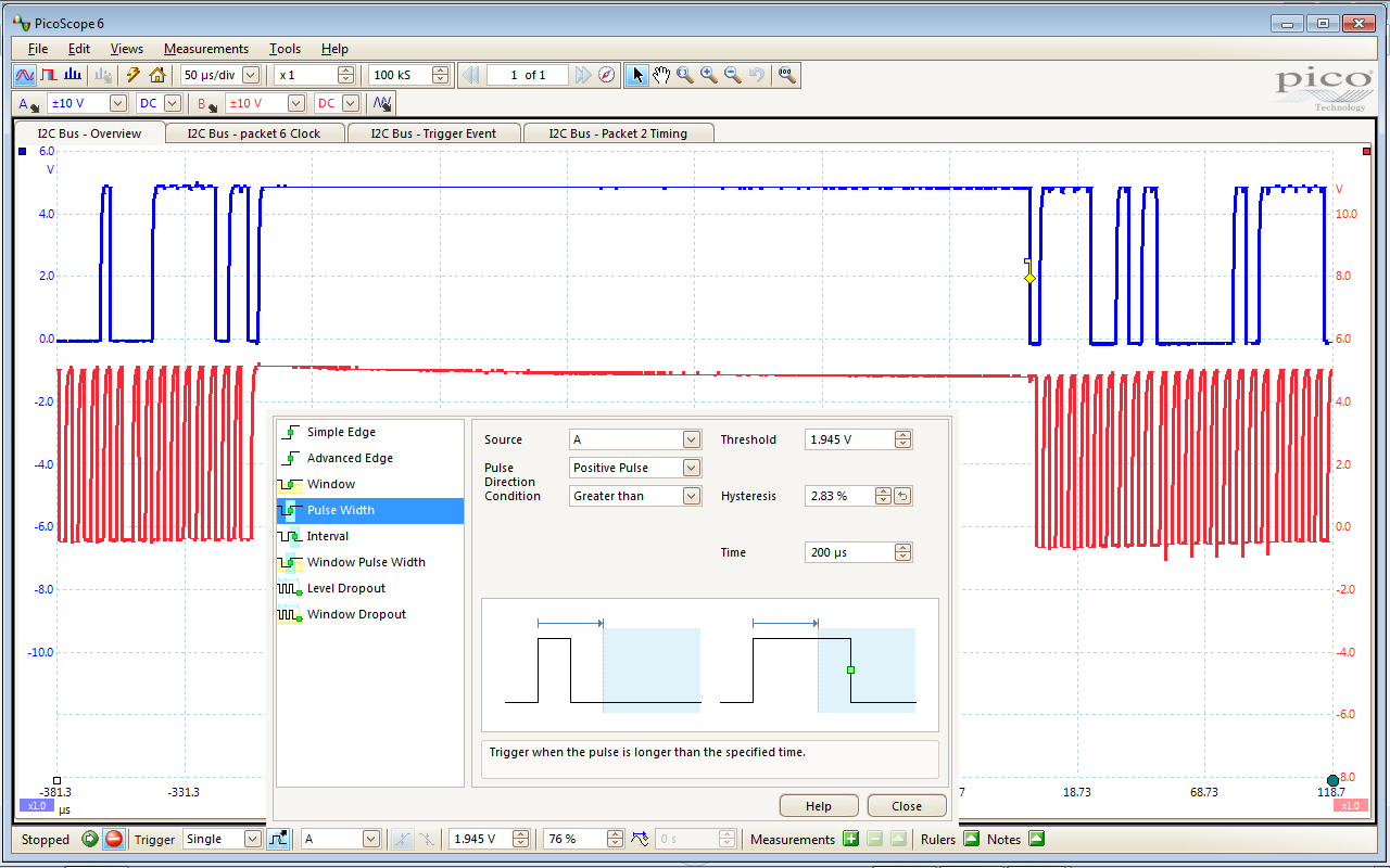 左上角的视图中我们可以看到整个捕获的波形,蓝色的是SDA,红色的是时钟信号。左下角显示的对触发信号的放大,此时脉冲宽度>200us。右上角是放大显示第六个捕获序列的时钟波形,右下角显示的了第二个数据包的时钟和时间关系。