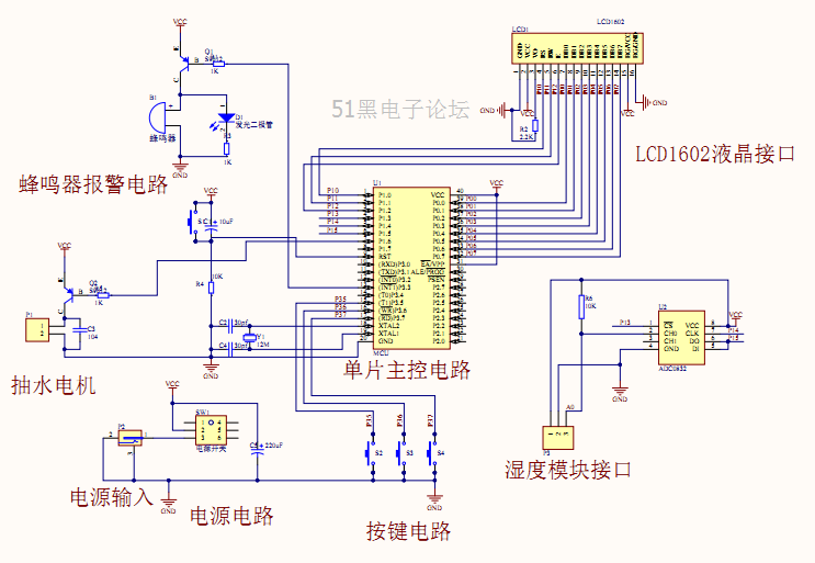 单片机土壤湿度检测自动浇花系统系统采用STC89C52单片机+ADC0832+LCD1602液晶+土壤湿度传感器+防水温度传感器+抽水电机+ 按键+蜂鸣器设计而成。