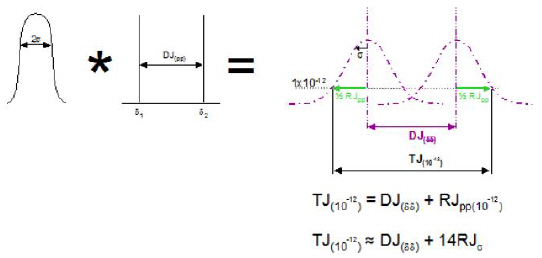 抖动是对时域信号的测量结果,反映了信号边沿相对其理想位置偏离了多少。抖动有两种主要成分:确定性抖动和随机抖动。确定性抖动是可以重复和预测的,其峰峰值是有界的,通常意义上的DJ是指其pk-pk值;随机抖动是不能预测的定时噪声,分析时一般使用高斯分布来近似表征,理论上可以偏离中间值无限大,所以随机抖动是没有峰到峰边界的,通常意义上的RJ指标是指其RMS值,可以根据其RMS值推算其在一定误码率时的值。目前最常用的分析方法是使用双狄拉克模型。该模型假定概率密度函数两侧的尾部是服从高斯分布的,高斯分布很容易模拟,并且可以向下推算出较低的概率分布。总抖动是RJ和DJ概率密度函数的卷积。
