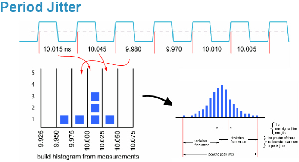 时钟抖动通常有三种测量方法,对应于TIE(Time Interval Error 时间间隔误差)、period(周期抖动)和Cycle-Cycle(相邻周期抖动)三种抖动指标。
