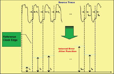 TIE抖动(时间间隔误差),以被测时钟沿与理想时钟沿之间的时间差为样本,即以图中的TIEn为样本,通过对很多个样本进行统计分析,表征时钟沿与理想时钟沿偏离值的变化、分布情况,如下图所示: