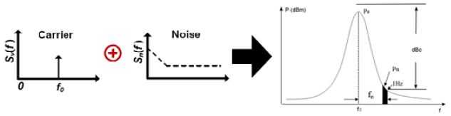 相位噪声反映的是单载波信号的频谱纯度,如果没有相位噪声,信号的所有功率都应集中在其振荡频率f0处(下图左Carrier),这个理想信号用Asin(ωt)表示。由于存在相位噪声(下图左Noise),相当于在理想信号上调制了一个Φ(t)相位信号,此时整个信号表示为Asin(ωt+Φ(t))。在频谱上体现为一部分功率扩展到相邻的频率中去,形成边带(下图右)。相噪定义为单边带某一给定偏移频率fn处1Hz带宽内的功率Pn与信号总功率Ps比值的对数,即 10lg(Pn/Ps),相噪以dBc/Hz@fn为单位来表示。这里dBc的含义是某频点功率与信号总功率的比值(下图右),对应于时钟相位偏移与时钟周期的比值。