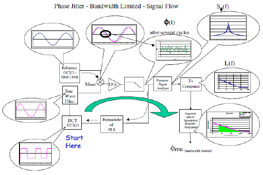 • 相噪测试时设定了具体的积分带宽,这个带宽一般在几十兆Hz以内。而时域抖动测试并没有带宽限制,其带宽限制只取决于示波器仪器本身;