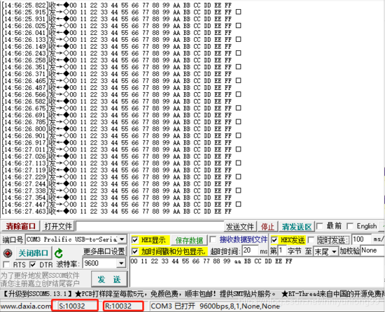 #include int main() { u8 to_recv[_UART_BUF_LEN_256]; u16 to_recv_len; init_hardware_usart2(9600); while (1) { if(func_usart2_recv_bytes(_UART_BUF_LEN_256, to_recv, &to_recv_len, _UART_COMM_INT_TIMEOUT_500MS, _UART_COMM_CH_TIMEOUT_3MS) == 0) { func_usart2_send_bytes(to_recv, to_recv_len); } to_recv_len = 0; memset(to_recv, 0, sizeof(to_recv)); } } 效果如下: 经过测试发现,串口调试助手给单片机发送了1W+多次,失误率为0,准确率可以应用。 测试代码,仅供参考。