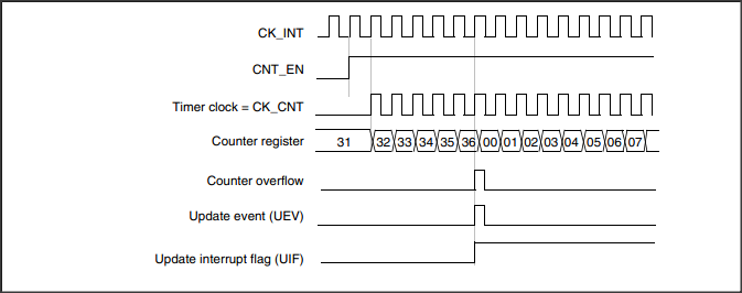 自动重装载寄存器决定了定时器的上溢时机,当定时器的计数器中数值达到了自动重装载寄存器规定的值,计数器就要归零。也就是说自动重装载寄存器决定了定时器的周期。假定TIMx_ARR=0x36,而且分频系数为1,则可以看到下边的情况。
