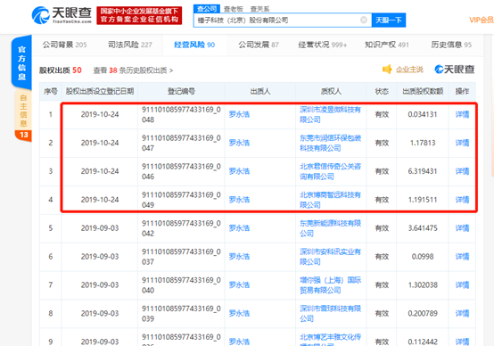 近日,据天眼查数据显示,锤子科技(北京)股份有限公司新增四条股权出质信息,罗永浩将自己的股权出质给北京君信传奇公关咨询有限公司、深圳市凌昱微科技有限公司、东莞市润信环保包装科技有限公司和北京博商智远科技有限公司。