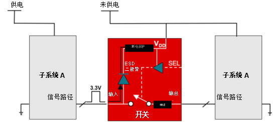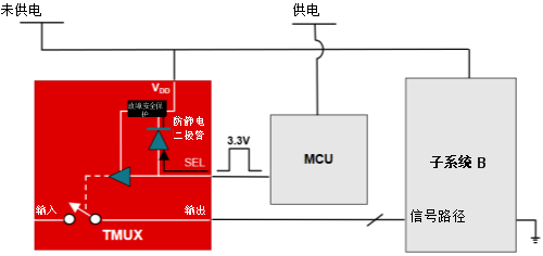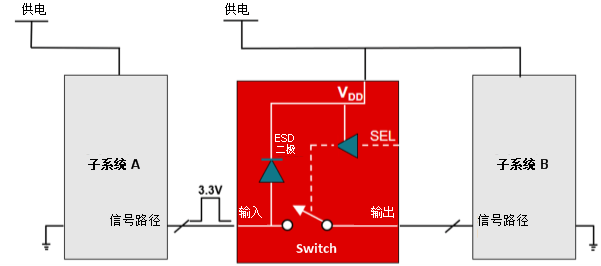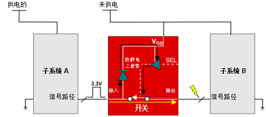 与图1对比,来自子系统A的3.3V信号为内部静电放电二极管反向供电,从而接通开关。这将关闭通往子系统B的信号路径,使信号从开关中(黄色箭头)漏出,从而出现错误的逻辑状态,这可能会损坏子系统B并中断系统启动。