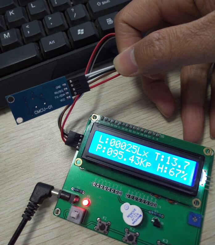从单片机板子和模块到手后 到制作完成总共花了1天时间!附实物图与相关程序,留给需要的人吧!其实还可以通过气压大小,有相应来计算出海拔高度。过段时间更新的时候我在上传上来。。。。3合1模块上的传感器:CMCU-01 SHT20+BMP180+BH1750FVI