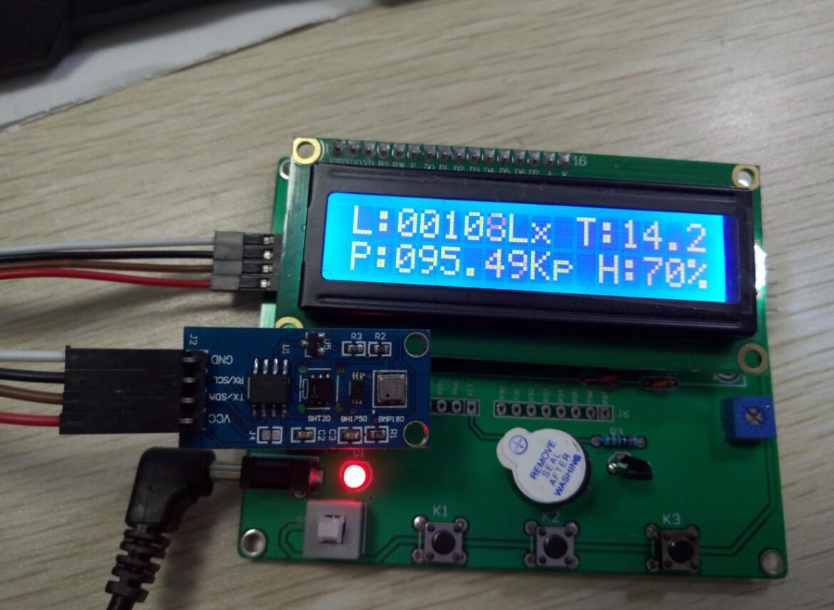 最近一直想做一个可以检测温湿度的,光照强度,还有气压检测的仪表。而且要精度高反应快的传感器,在网上找了一圈,看的眼花缭乱,符合要求的价格都不低,无意中看到某宝看到一个温湿度、气压、光照度三合一的传感模块,最重要的是模块上面集成的温湿度芯片是我首选的SHT20,还有光照强度传感器BH1750. ,都符合自己的要求,这2款芯片在大学的时候就有所了解,算是温度检测和光照检测领域里,精度高,体积非常小,性价比很高的一款。气压传感器一般都是采用BMP180或者BMP085,这2个芯片也差不多的,现在用BMP180的感觉要多一些。非常符合设计需要。 再加上这个模块是串口输出,直接就可以读取数据啦。哈哈哈,根本不需要自己去进行3个传感器的驱动代码编程,。(其实之前我也买个单独的模块回来,本来打算3个模块并联使用,,奈何程序花了好几天时间都没有调试通过,后来模块直接都不知道丢哪里去了。)。于是果断重新就此准备自己重新制作一个。 因为是模块,没有相关的显示屏,硬着头皮问卖家能不能拿送个显示屏................结果和预想的一样。需要单独购买。好吧,又买了一块单片机的板子,到手拼接后,开始查资料制作,于是出现了此贴。