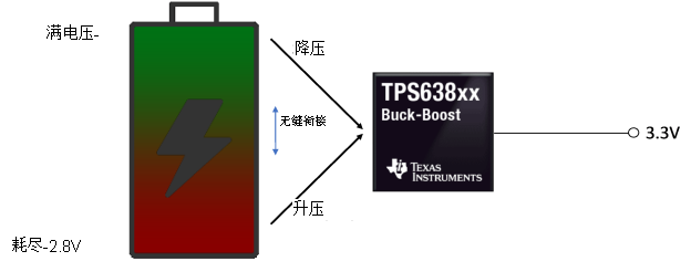 例如,假设要使一个典型电压范围为4.2V到2.8V的锂离子电池提供3.3V的输出电压,如果使用降压转换器,那么电池的截止电压必须大于3.3V,缺点则是无法有效利用电池中存储的电能。而降压-升压转换器有助于充分利用电池的所有电能,因为当输入电压等于或低于3.3V时,降压-升压转换器还可以消耗存储的电能,如图2所示。