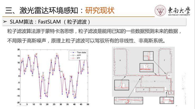 激光 SLAM 大家用的比较多,它相对以前的设备更精确,信息更丰富,能够进行很多移动物体的检测。这个过程当中,我们希望把车辆的很多非线性状态,用卡尔曼滤波做一个很好的估计,包括预测、环境观测、地图更新。之后我们还可以把里面所有常规问题转化为图像处理。