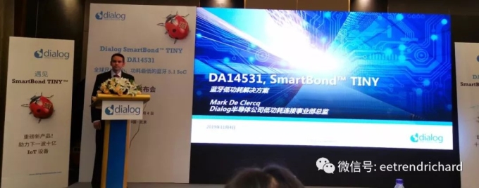 据他介绍,这款芯片又名SmartBond TINY™(这个系列未来还有产品在规划)现已开始量产,封装尺寸仅为2.0 x 1.7 mm,这颗芯片就是为了助推下一波10亿IoT设备而设计的,这波浪潮的价格门槛是0.5美元,其用量是每年1000万片级别。Mark表示Dialog的低功耗蓝牙产品有两个系列---DA146xx系列为高端系列 ,DA145XX为低端系列,这次发布的DA14531属于低端系列暂不支持蓝牙5.1的室内定位技术,但它支持蓝牙5.1核心规范。