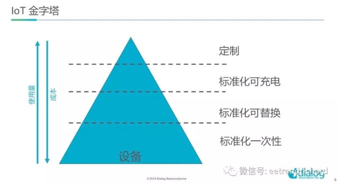 那这10亿设备来自哪里呢??他以一个金字塔为例,把目前蓝牙产品市场做个划分,基本是个金字塔---塔底端成本低用量大,塔尖是定制化产品但用量并不大 ,从塔尖逐渐往下,实际上产品是从定制往标准件发展,从标准化可充电发展到标准化可替代,再发展到标准化一次性设备。而DA14531瞄准的就是塔底的蓝牙设备。