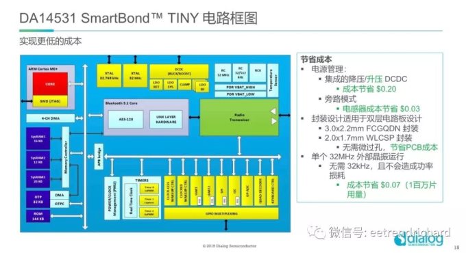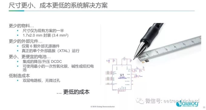 他还详细分析了Dialog如何实现0.5美元成本,其过程可谓的是精打细算、锱铢必较,首先是提升集成,就是把外部元件降低到最少,仅需6颗外部无源器件、1个时钟源、1个电源即可实现完整的蓝牙低功耗系统。对于开发人员来说,这意味着SmartBond TINY可以轻松地装进任何产品设计,如电子手写笔、货架标签、信标、用于物品追踪的有源RFID标签等。