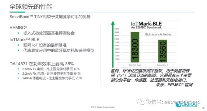 Mark 表示虽然DA14531的尺寸很小,成本很低但其性能并没有打折,这个方案都经过了最新的IoT连接EEMBC基准IoTMark™-BLE测评,并获得了高分,例如IoTMark™-BLE测评获得了破纪录的18300高分,比竞品高35% 。